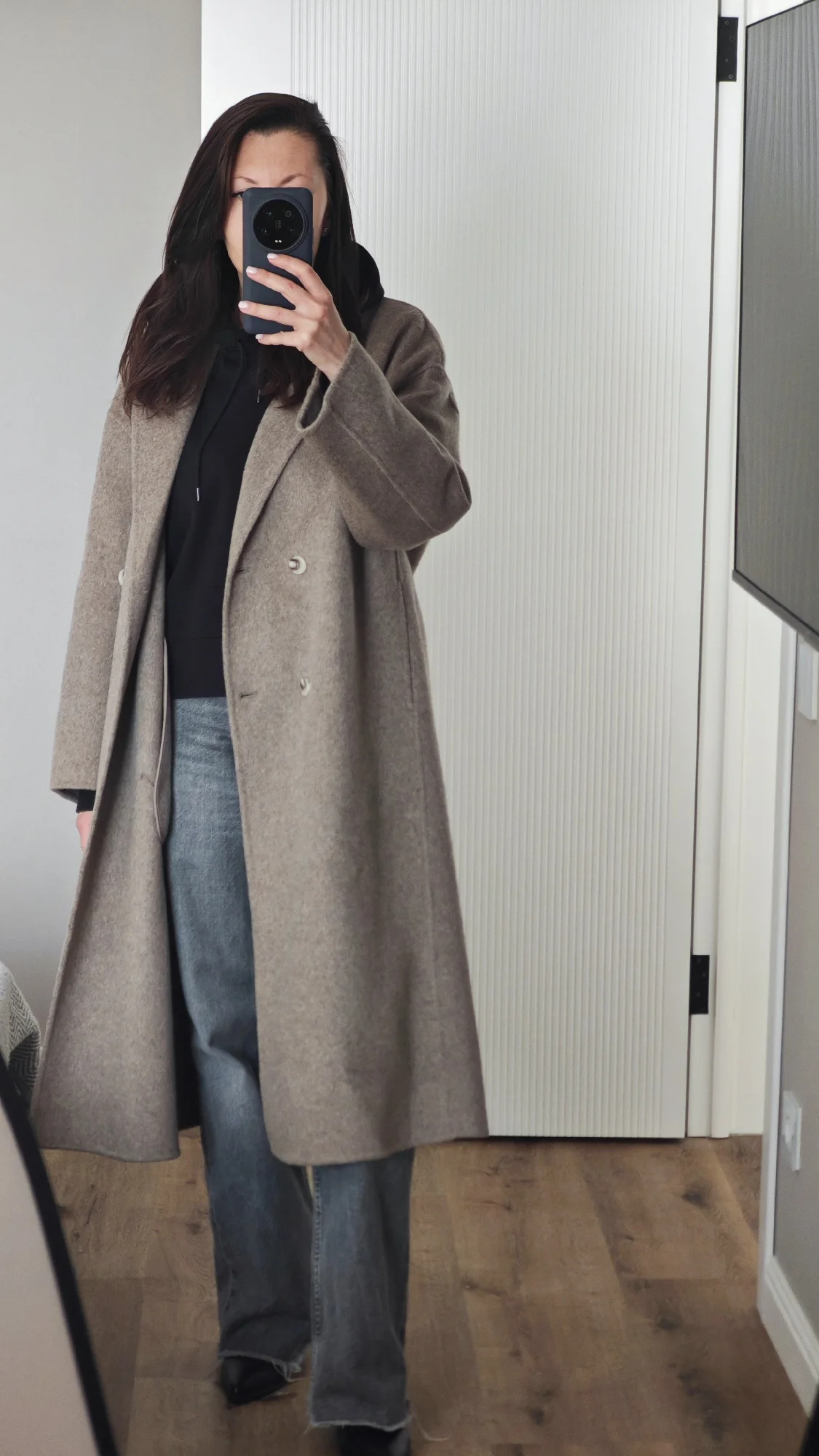 A timeless long woolen coat with a relaxed double-breasted silhouette. Designed with drop shoulders and a clean V-neckline for an effortlessly refined look. The soft double-sided wool blend offers warmth and structure, making it a classic staple for autumn and winter.