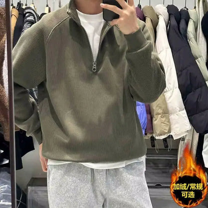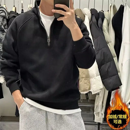 A minimalist half-zip sweatshirt featuring a structured stand-up collar. Designed for a relaxed fit and subtle texture, it offers a modern balance between comfort and style. Ideal for layering through autumn and winter.