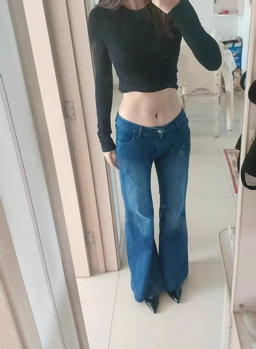 Description: Featuring a slim fit through the hip and thigh that widens into a soft flare, these jeans offer a defined silhouette. The vintage-inspired light wash and button fly create an authentic Y2K look.